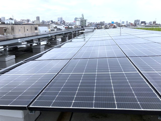 ※2棟の建物のうち、1棟の屋根全面に配置可能な最大のアレイを実装しています。蓄電池を組込み、商用電源停電時に非常電源としての利用を可能としています。