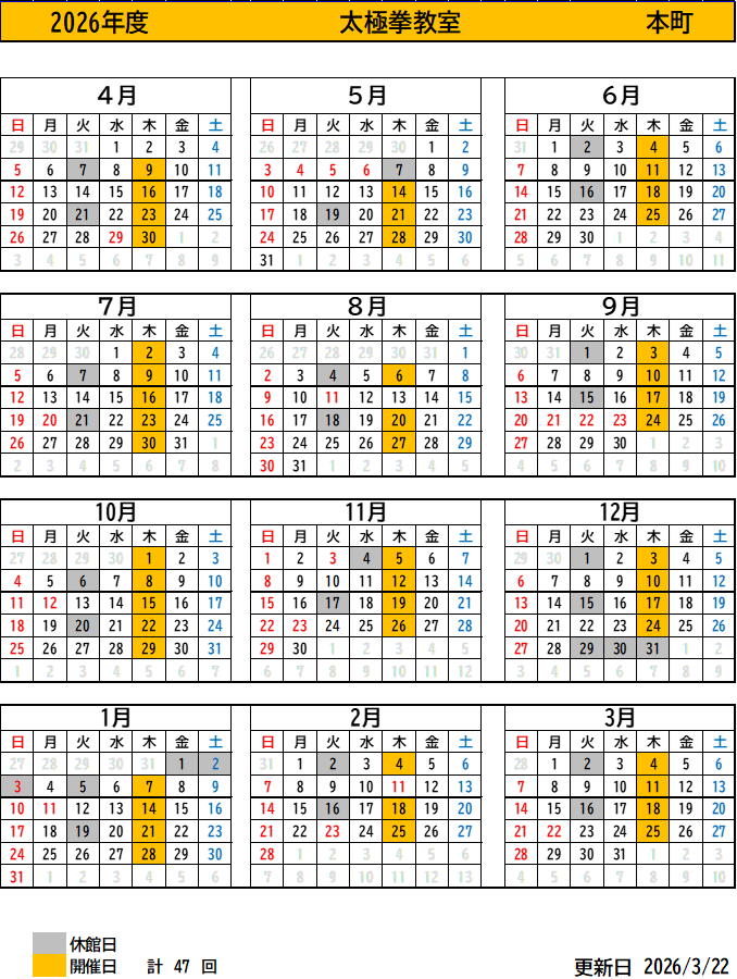 本町CC太極拳教室を通年スクールとして開催いたします。